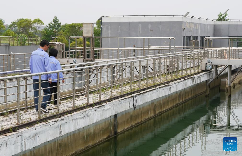 Staff members check a flocculation and sedimentation tank at Jiangsu Fenghai New Energy Seawater Desalination Development Co., Ltd. in Yancheng, east China's Jiangsu Province, June 7, 2025.