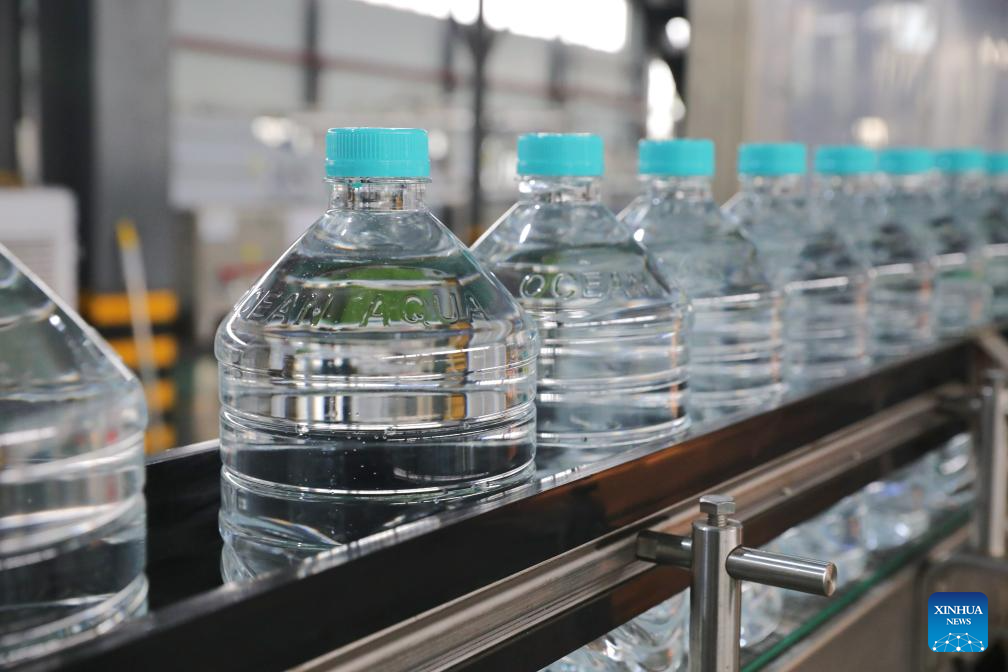 This photo shows bottled drinking water at a workshop of Jiangsu Fenghai New Energy Seawater Desalination Development Co., Ltd. in Yancheng, east China's Jiangsu Province, June 7, 2025.