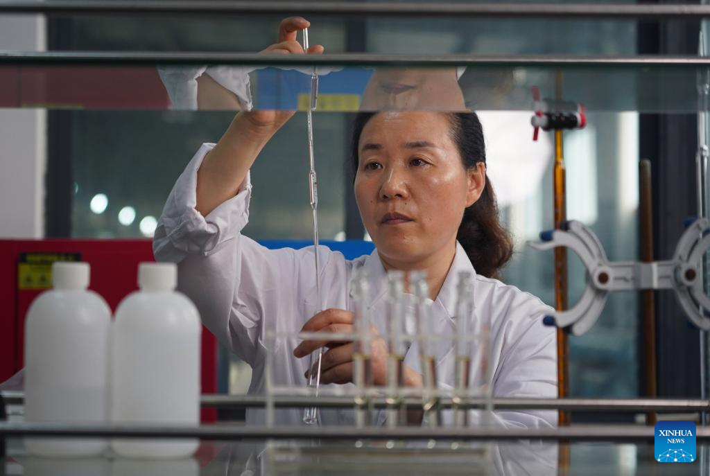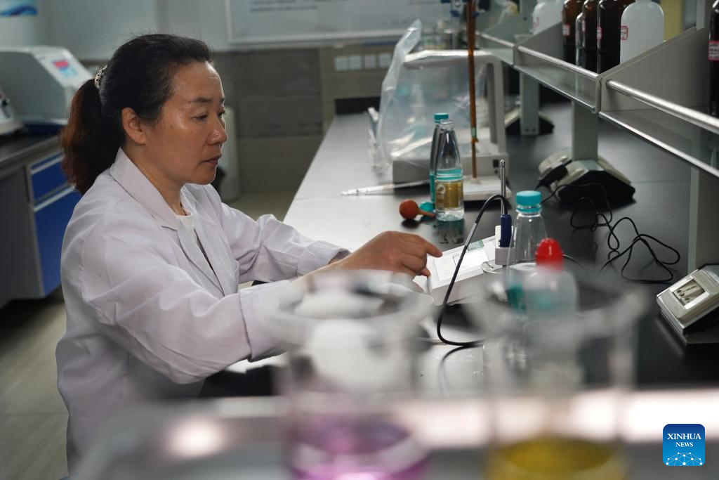 A staff member tests drinking water after seawater desalination at Jiangsu Fenghai New Energy Seawater Desalination Development Co., Ltd. in Yancheng, east China's Jiangsu Province, June 7, 2025.