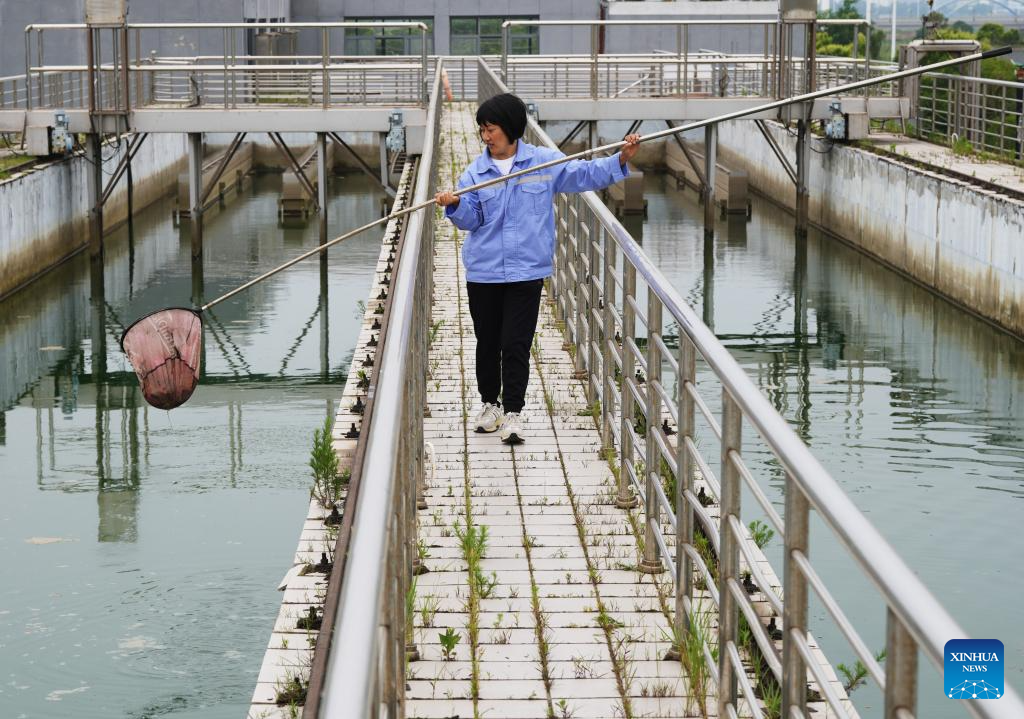 A staff member cleans floating debris from a flocculation and sedimentation tank at Jiangsu Fenghai New Energy Seawater Desalination Development Co., Ltd. in Yancheng, east China's Jiangsu Province, June 7, 2025.