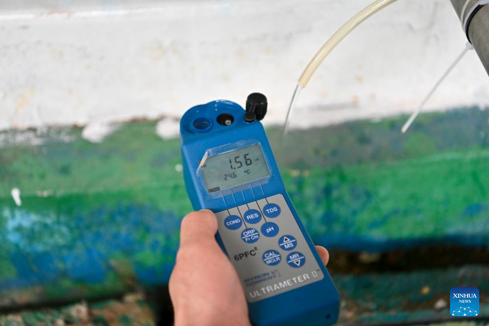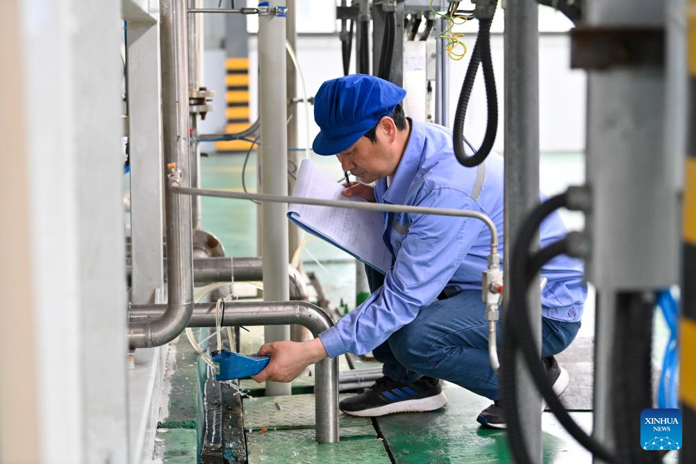 A staff member tests water conductivity at a seawater desalination workshop of Jiangsu Fenghai New Energy Seawater Desalination Development Co., Ltd. in Yancheng, east China's Jiangsu Province, June 7, 2025.