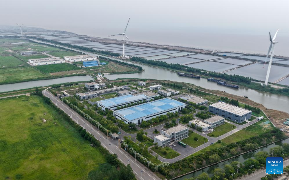 An aerial drone photo shows Jiangsu Fenghai New Energy Seawater Desalination Development Co., Ltd. in Yancheng, east China's Jiangsu Province, June 7, 2025.