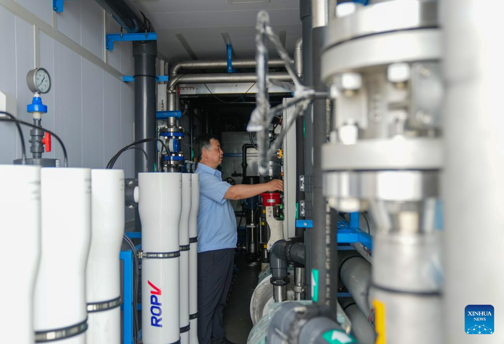 A staff member adjusts equipment inside a containerized desalination plant at Jiangsu Fenghai New Energy Seawater Desalination Development Co., Ltd. in Yancheng, east China's Jiangsu Province, June 7, 2025.