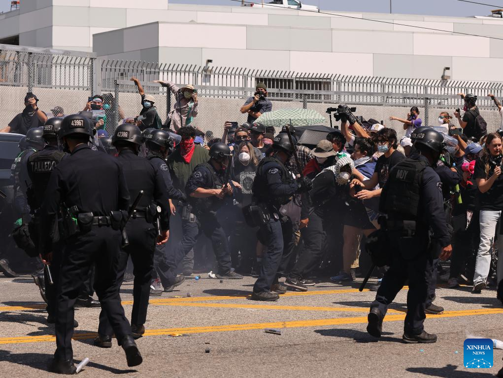 In response, Trump ordered the deployment of 2,000 National Guard members on Saturday. The protests intensified further on Sunday, with growing crowds and heightened confrontations between demonstrators and law enforcement officers. (Photo by Zeng Hui/Xinhua)