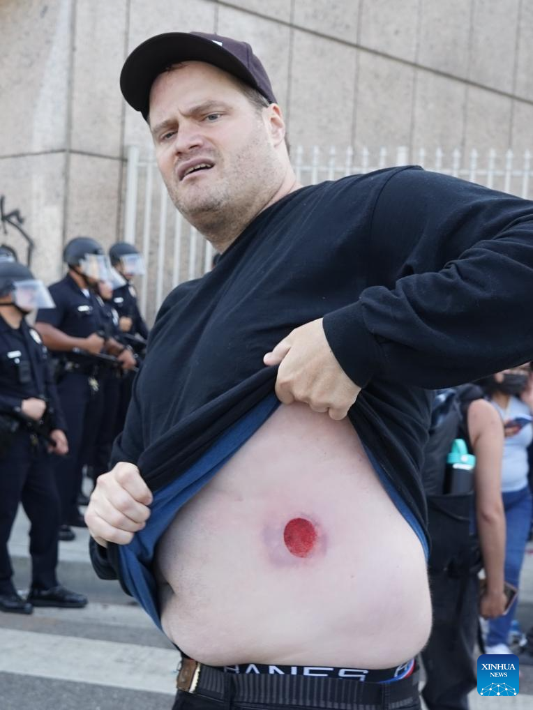 A demonstrator shows the scar caused by police in downtown Los Angeles, California, the United States, June 8, 2025.