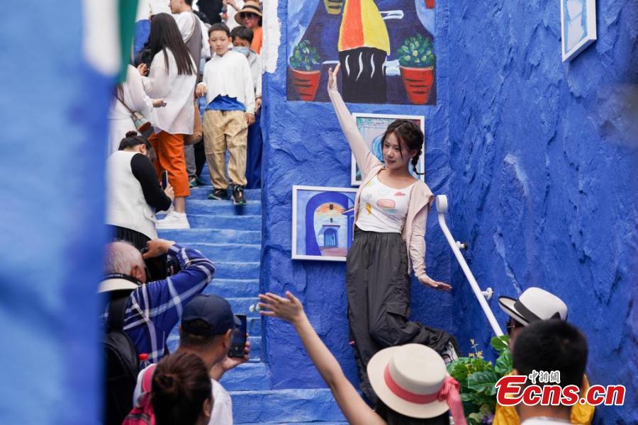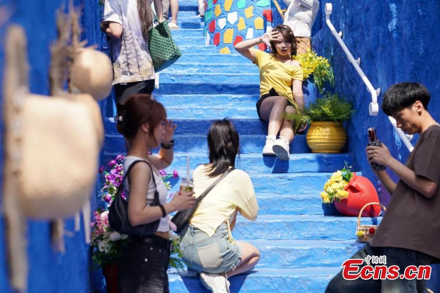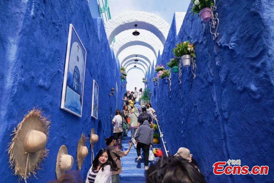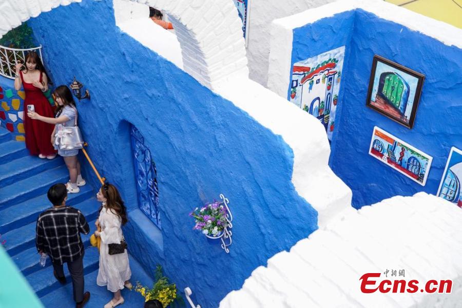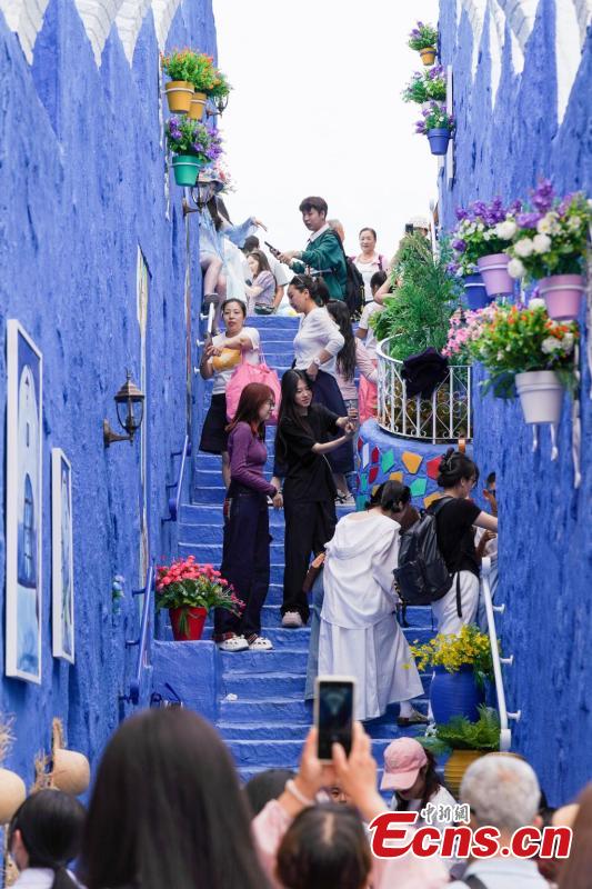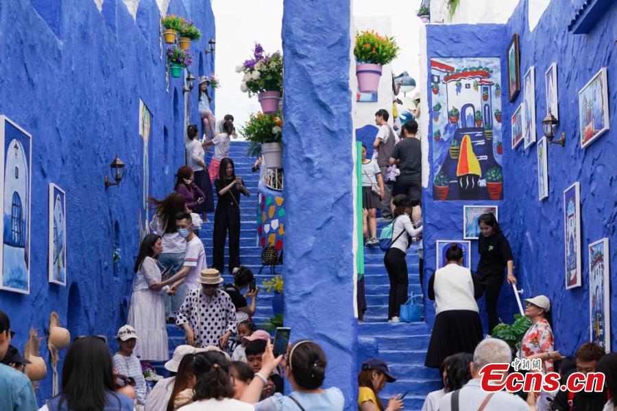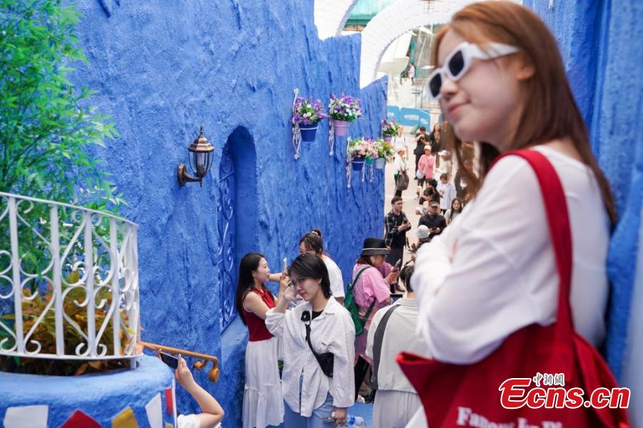 Tourists visit a replica of Morocco’s “blue city” Chefchaouen, at Harbin Polarland in Harbin, northeast China’s Heilongjiang Province, June 8, 2025. (China News Service/Zhao Yuhang)