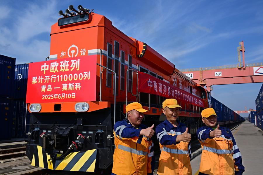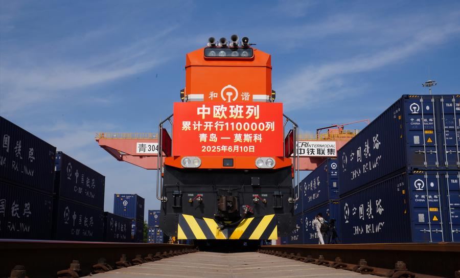 This photo shows the 110,000th China-Europe freight train bound for Moscow of Russia, departing from Jiaozhou Railway Station in Qingdao, east China's Shandong Province, June 10, 2025. (Xinhua/Yin Dongxun)