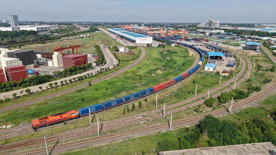 An aerial drone photo shows the 110,000th China-Europe freight train departing from Jiaozhou Railway Station in Qingdao, east China's Shandong Province, June 10, 2025. (Xinhua/Li Ziheng)