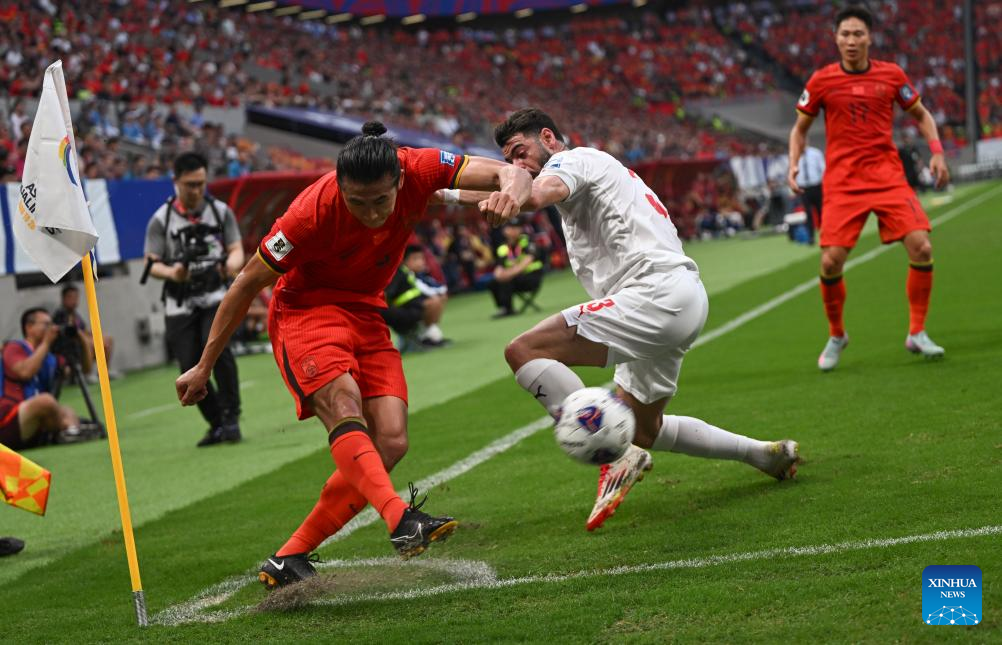 Zhang Yuning (L) of China kicks the ball during the 2026 FIFA World Cup Asian Qualifiers Group C match between China and Bahrain in Chongqing, southwest China, June 10, 2025. (Xinhua/Chen Cheng)