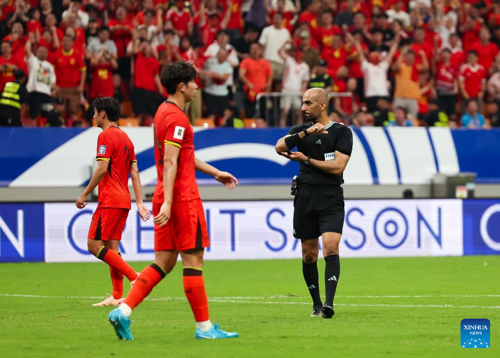 Referee Adel Ali Alnaqbi (R) gestures for a handball during the 2026 FIFA World Cup Asian Qualifiers Group C match between China and Bahrain in Chongqing, southwest China, June 10, 2025. (Xinhua/Hu Xingyu)