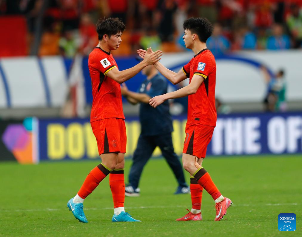 Wang Yudong (R) of China reacts after the 2026 FIFA World Cup Asian Qualifiers Group C match between China and Bahrain in Chongqing, southwest China, June 10, 2025. (Xinhua/Hu Xingyu)