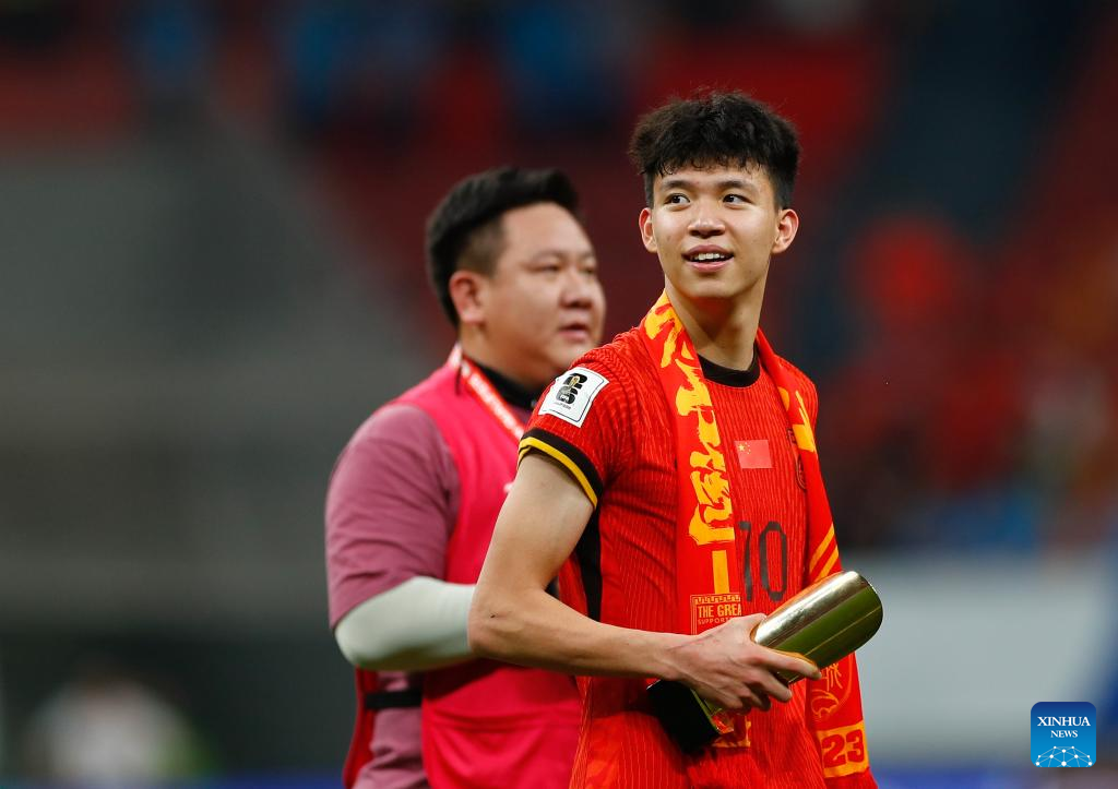 Wang Yudong (front) of China greets spectators after the 2026 FIFA World Cup Asian Qualifiers Group C match between China and Bahrain in Chongqing, southwest China, June 10, 2025. (Xinhua/Huang Wei)