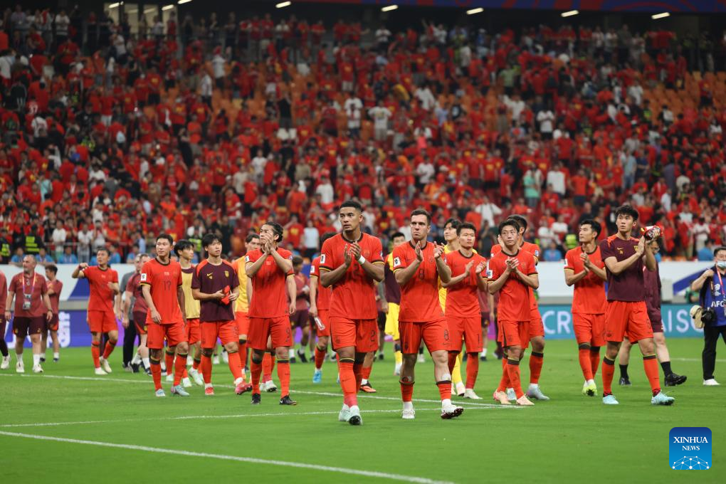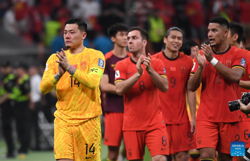 Players of China greet spectators after the 2026 FIFA World Cup Asian Qualifiers Group C match between China and Bahrain in Chongqing, southwest China, June 10, 2025. (Xinhua/Hu Xingyu)