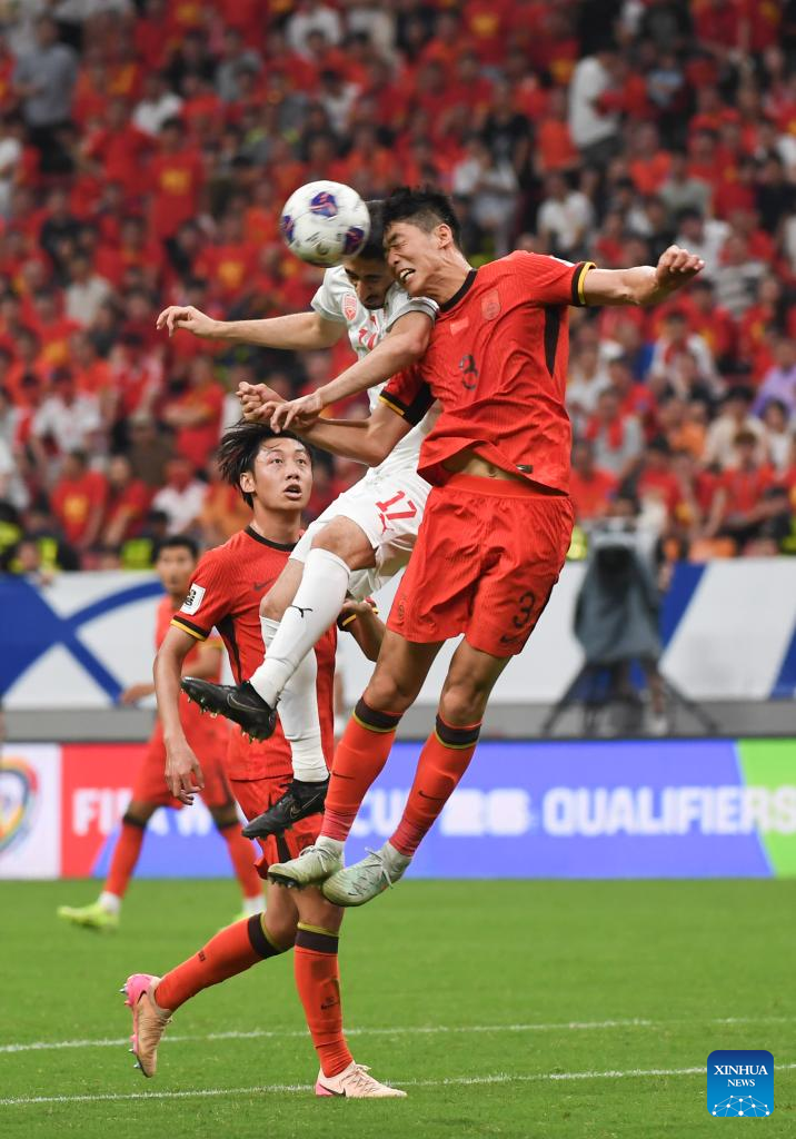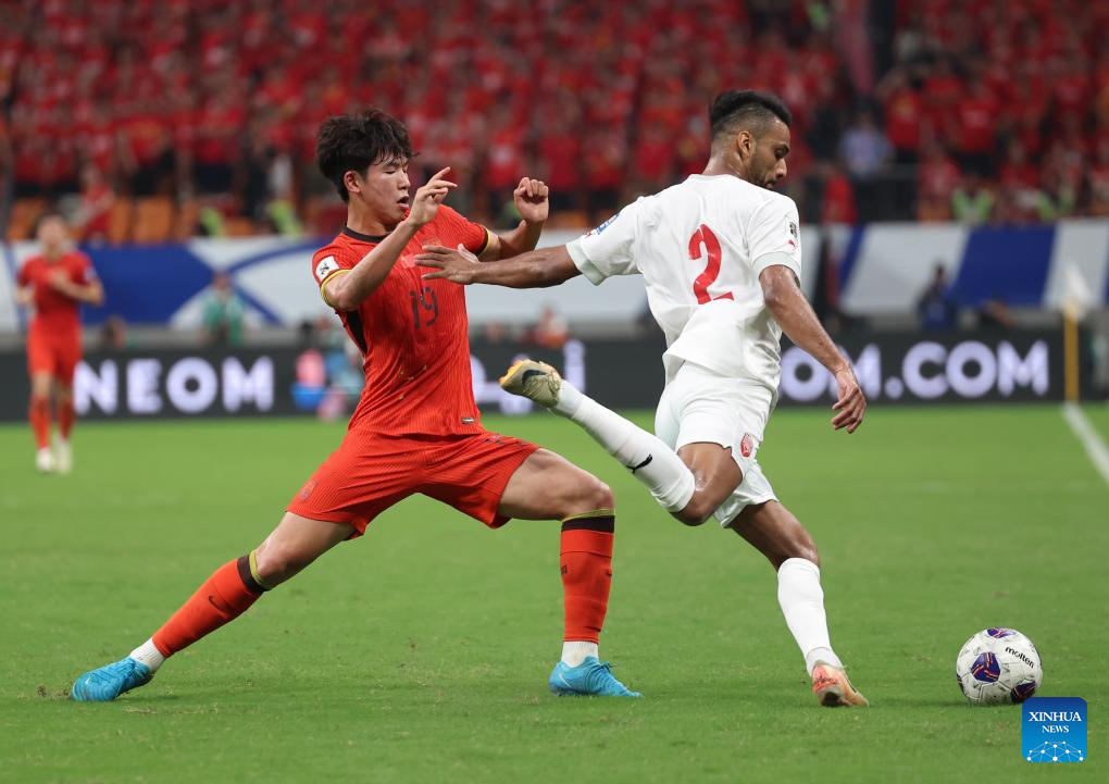 Liu Chengyu (L) of China vies with Amine Benaddi of Bahrain during the 2026 FIFA World Cup Asian Qualifiers Group C match in Chongqing, southwest China, June 10, 2025. (Xinhua/Hu Xingyu)