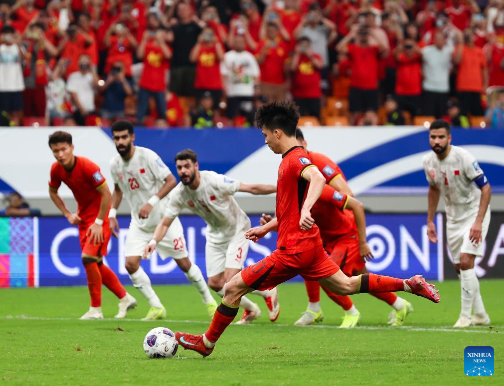 Wang Yudong (front) of China scores a penalty during the 2026 FIFA World Cup Asian Qualifiers Group C match between China and Bahrain in Chongqing, southwest China, June 10, 2025. (Xinhua/Hu Xingyu)