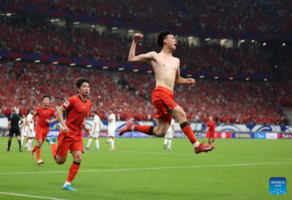 Wang Yudong (top) of China celebrates his goal during the 2026 FIFA World Cup Asian Qualifiers Group C match between China and Bahrain in Chongqing, southwest China, June 10, 2025. (Xinhua/Hu Xingyu)