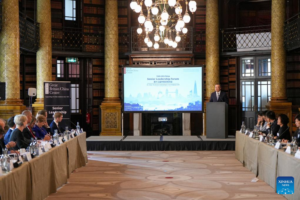 Liu Jianchao (at the podium), head of the International Department of the Communist Party of China Central Committee, speaks at the 13th UK-China Leadership Forum in London, Britain, on June 9, 2025. A delegation led by Liu Jianchao, head of the International Department of the Communist Party of China Central Committee, concluded a three-day visit to the United Kingdom (UK) on Tuesday after attending the 13th UK-China Leadership Forum in London. (Xinhua/Wu Lu)