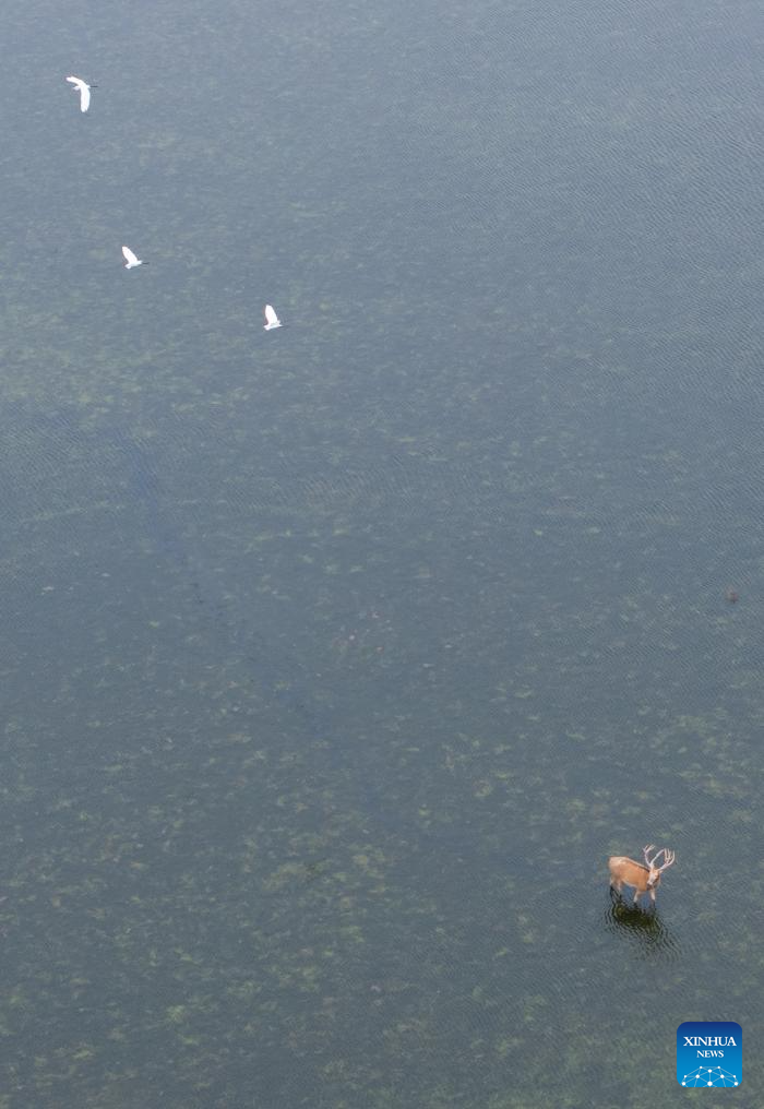 An aerial drone photo taken on June 7, 2025 shows a milu deer in Tiaozini wetland in Dongtai of Yancheng City, east China's Jiangsu Province. Yancheng City of east China's Jiangsu Province is home to the world's largest milu deer reserve, the largest wild milu deer population in the world, and the world's largest milu deer gene pool.
