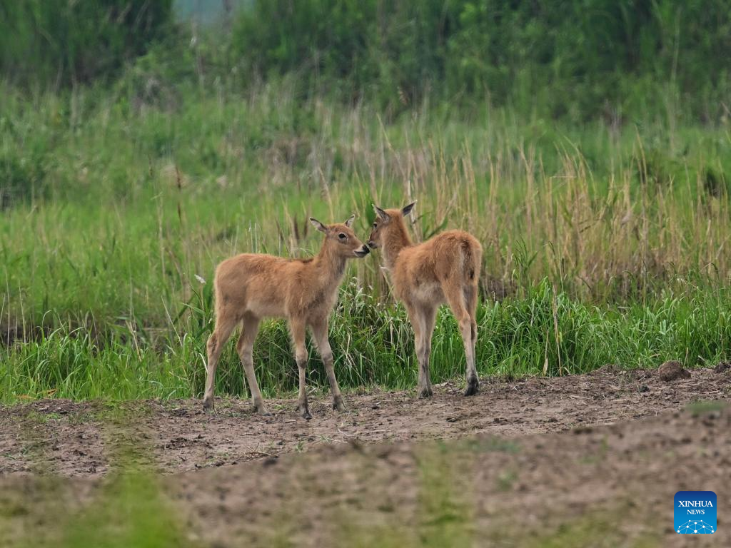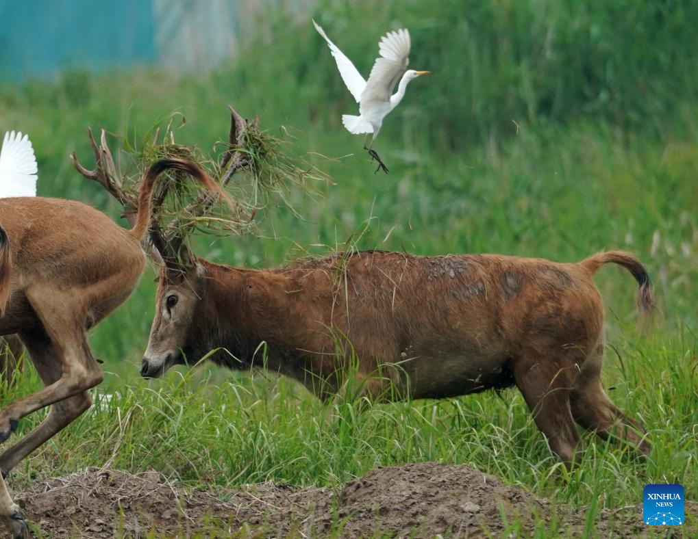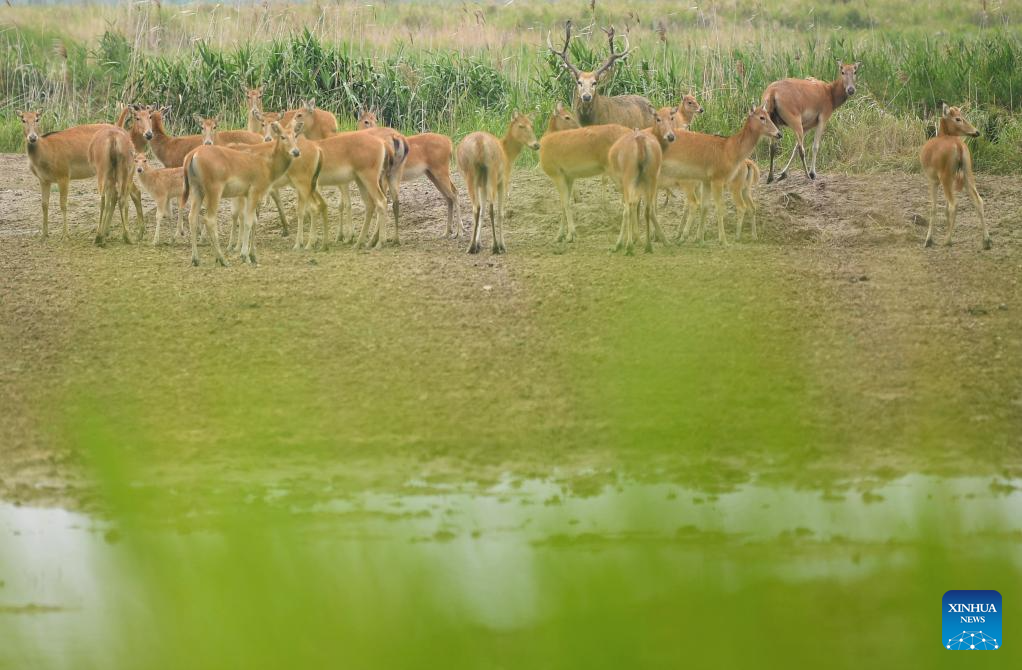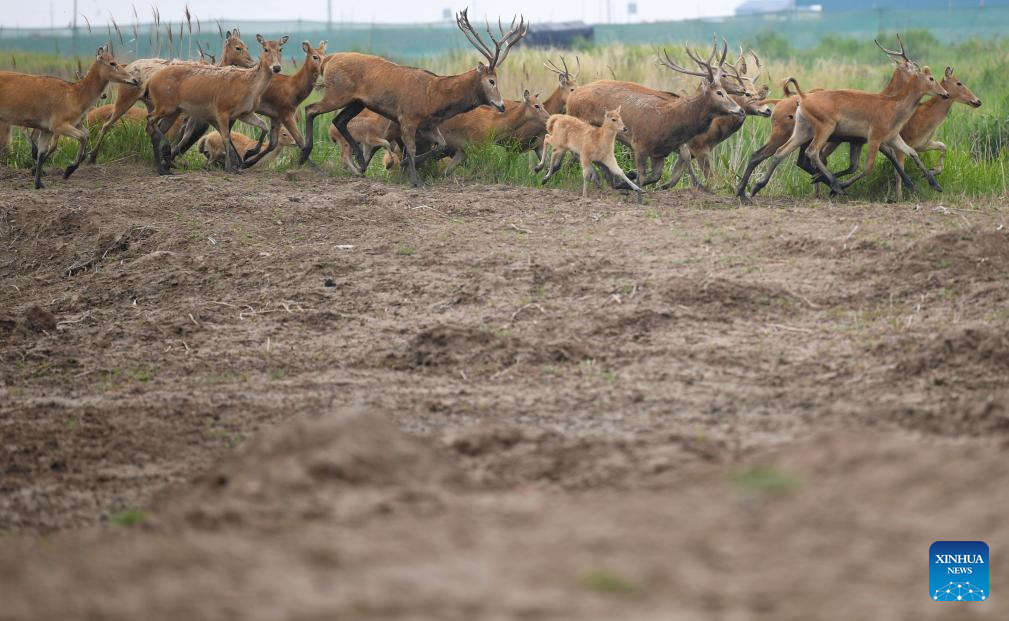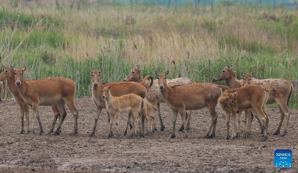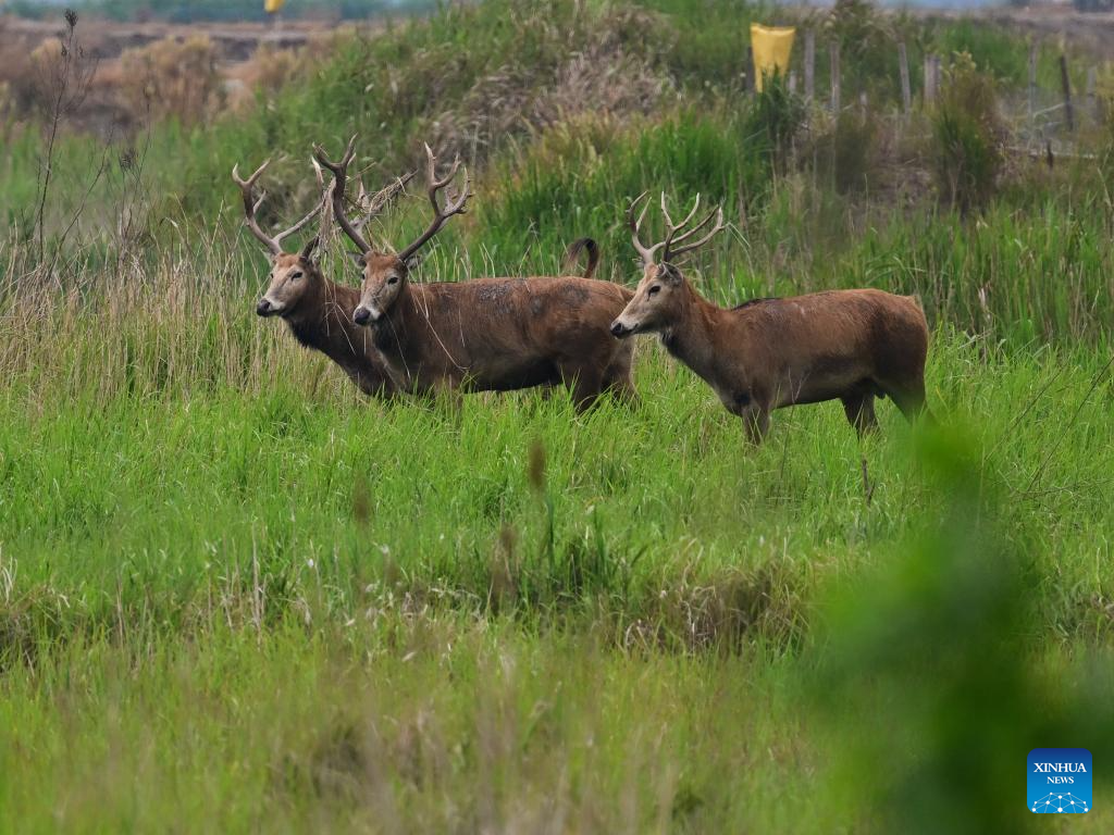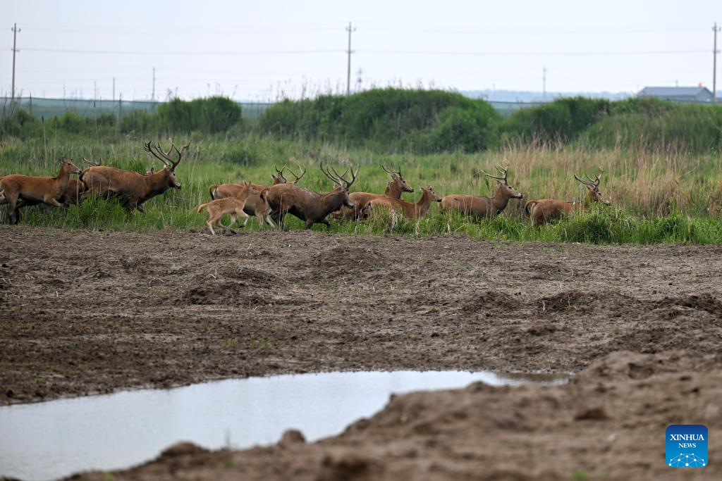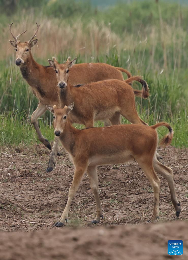 This photo taken on June 7, 2025 shows milu deer in Tiaozini wetland in Dongtai of Yancheng City, east China's Jiangsu Province. Yancheng City of east China's Jiangsu Province is home to the world's largest milu deer reserve, the largest wild milu deer population in the world, and the world's largest milu deer gene pool.