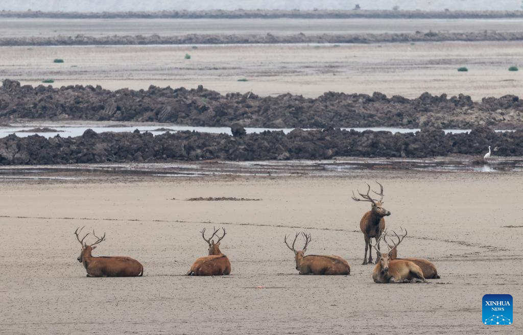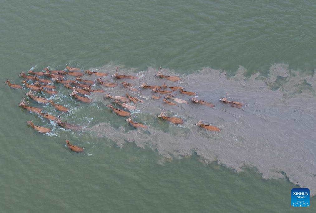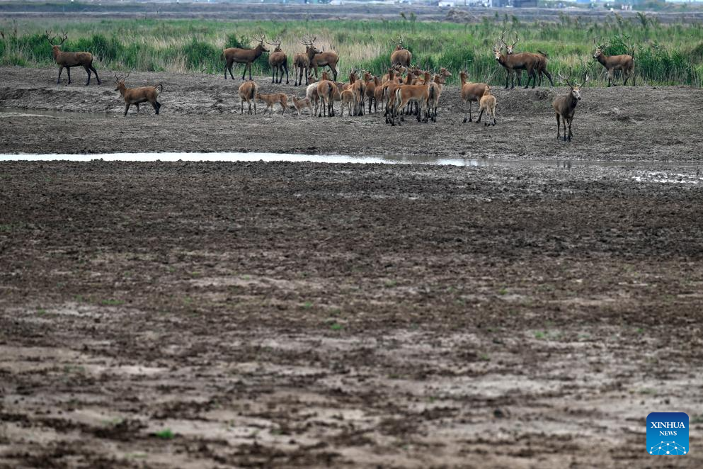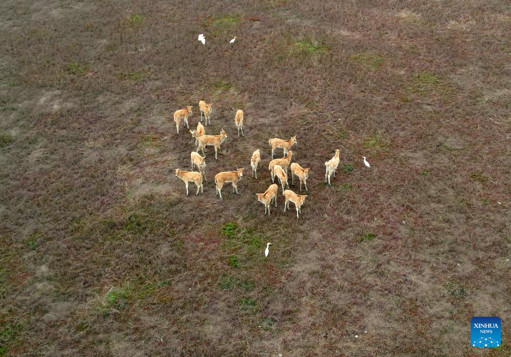 By the end of 2024, the milu deer population in the Yancheng reserve area had reached over 8,200, accounting for nearly 70 percent of the global milu deer population. (Xinhua/Hao Yuan)