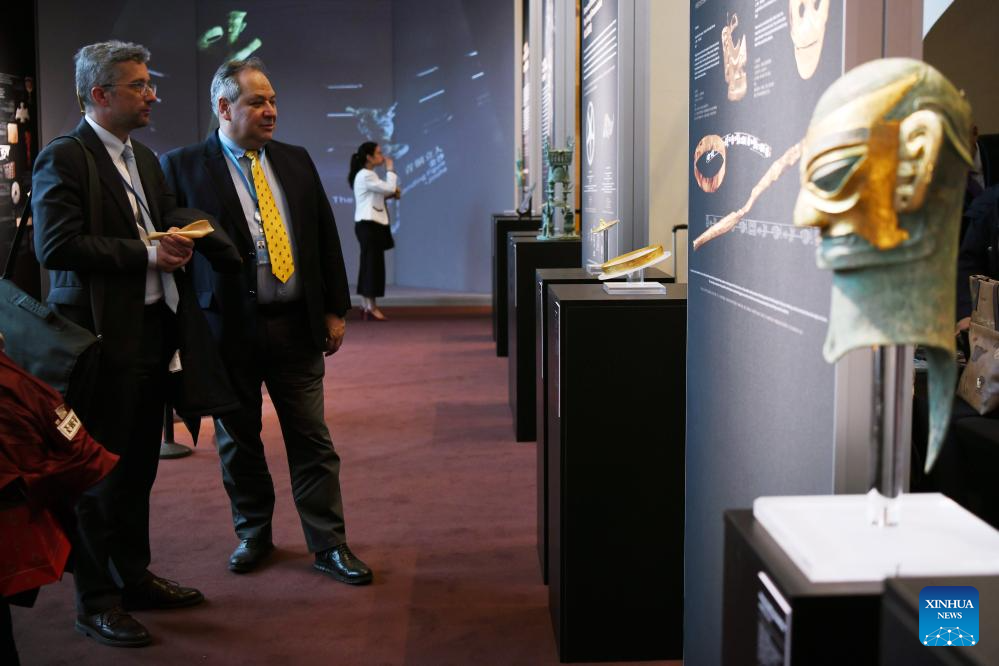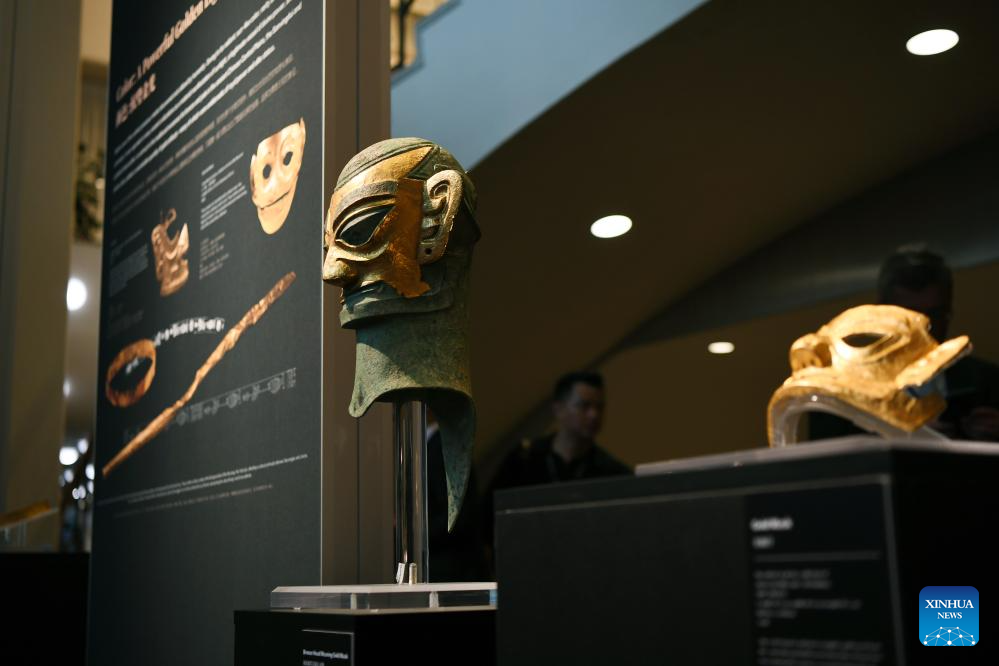 Themed "Light of the Sun -- Ancient Shu Civilization and the World," the exhibition draws on artifacts and motifs from the renowned Sanxingdui and Jinsha archaeological sites in southwest China, which date back approximately 3,600 to 2,800 years. (Xinhua/Li Rui)