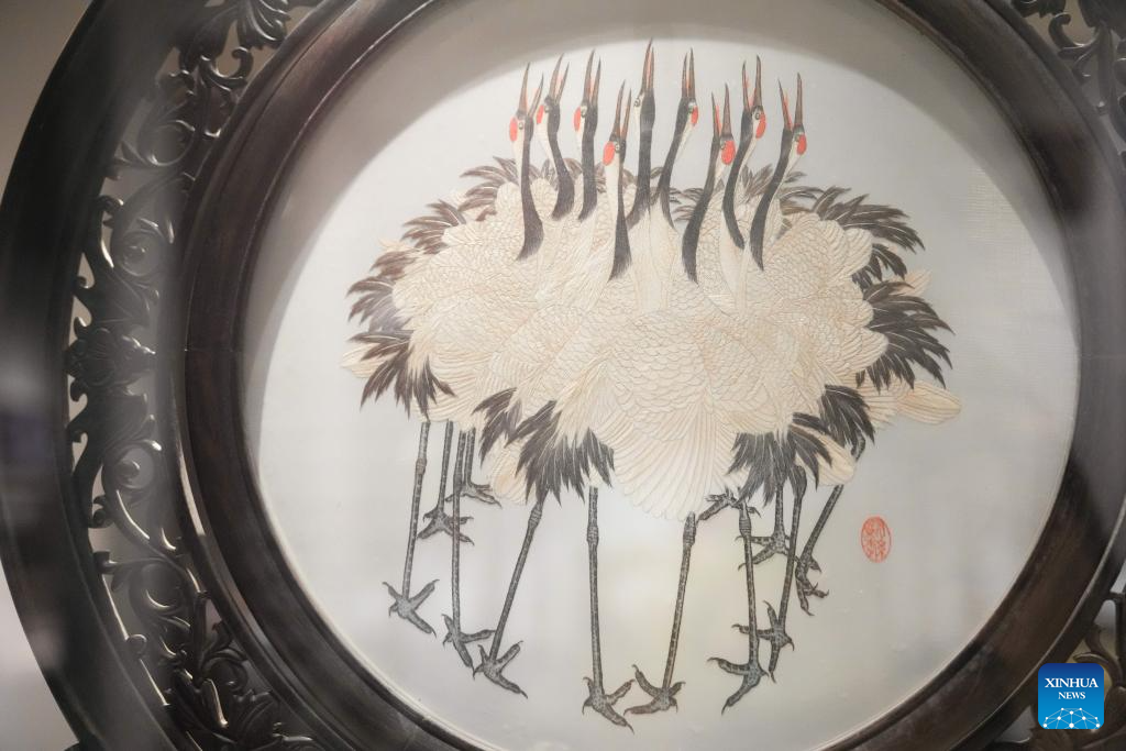 Hair embroidery artworks are displayed at the Dongtai Museum in Dongtai City, Yancheng of east China's Jiangsu Province, June 6, 2025. (Xinhua/Xue Yuge)