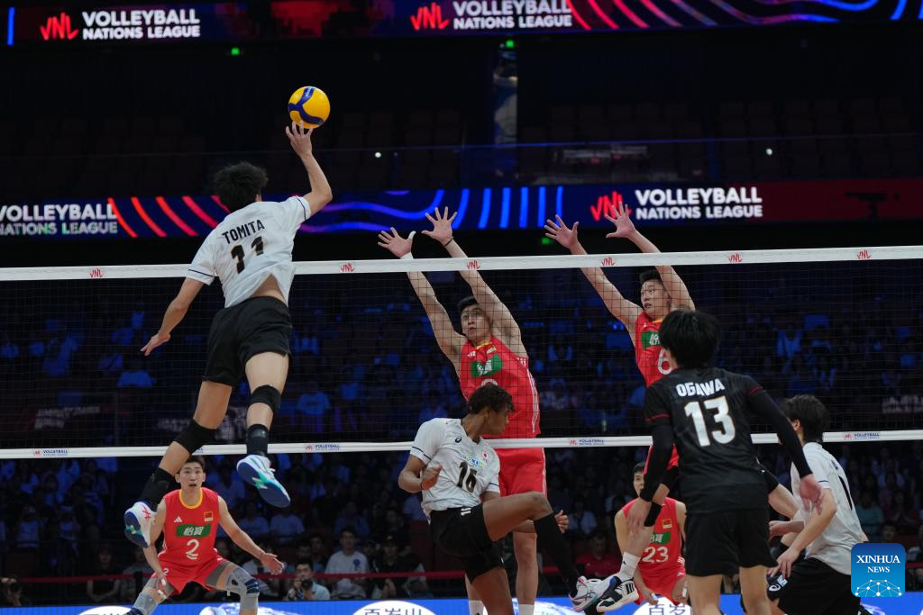 Larry Ik Evbade-Dan (R) of Japan checks on Li Yongzhen of China during the Pool 3 match between China and Japan at the Men's Volleyball Nations League (VNL) 2025 in Xi'an, northwest China's Shaanxi Province, June 11, 2025. (Xinhua/Li Yibo)