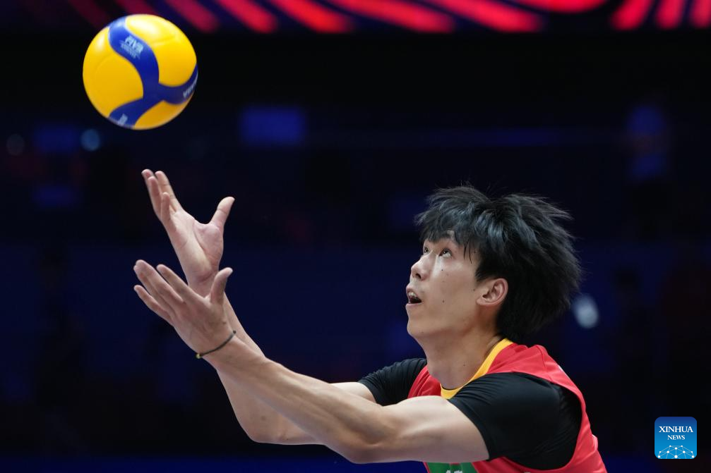 Wang Bin of China serves the ball during the Pool 3 match between China and Japan at the Men's Volleyball Nations League (VNL) 2025 in Xi'an, northwest China's Shaanxi Province, June 11, 2025. (Xinhua/Li Yibo)