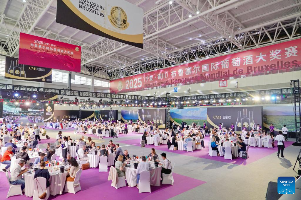 This photo taken on June 10, 2025 shows the main venue of the 32nd Concours Mondial de Bruxelles (CMB) in Yinchuan, northwest China's Ningxia Hui Autonomous Region. Making its China debut in 2018 in Beijing, the CMB has this year brought together nearly 400 international judges and over 7,000 wine samples, including a record number of entries from China, according to CMB Chairman Baudouin Havaux. (Xinhua/Du Juanjuan)