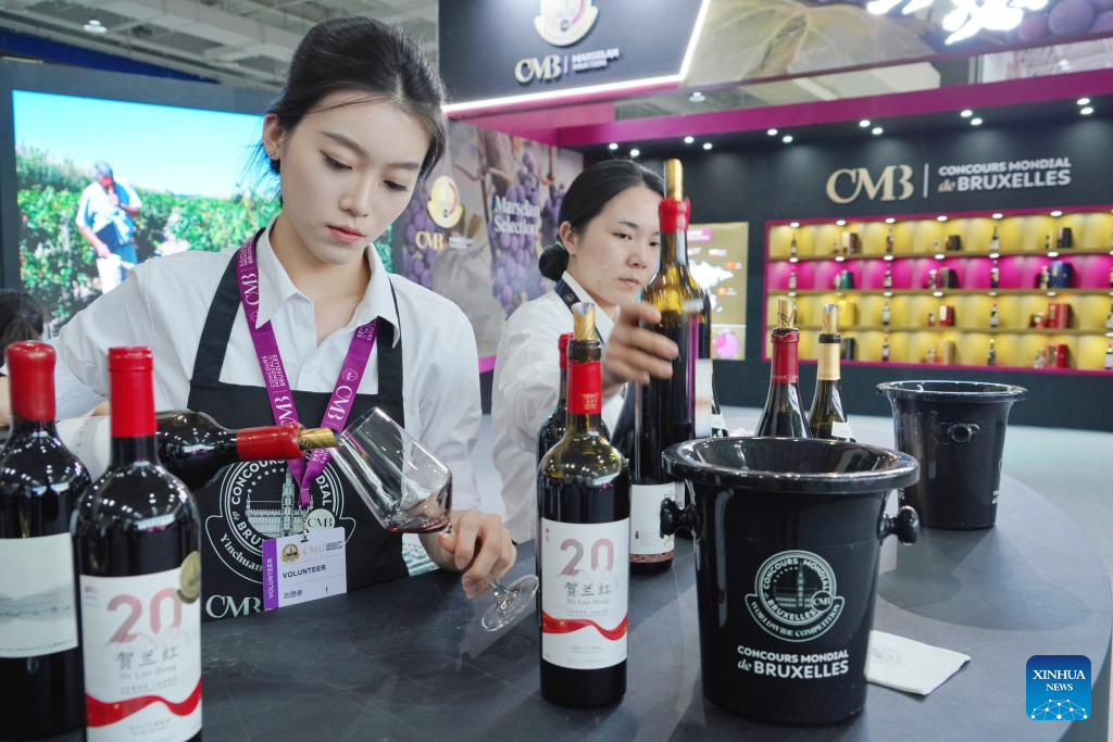 Volunteers serve wine produced in the eastern foot of Helan Mountain during the 32nd Concours Mondial de Bruxelles (CMB) in Yinchuan, northwest China's Ningxia Hui Autonomous Region, June 10, 2025. Making its China debut in 2018 in Beijing, the CMB has this year brought together nearly 400 international judges and over 7,000 wine samples, including a record number of entries from China, according to CMB Chairman Baudouin Havaux. (Xinhua/Du Juanjuan)