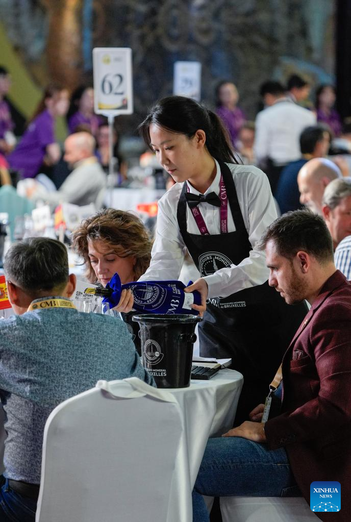 A staff member serves wine for a blind taste during the 32nd Concours Mondial de Bruxelles (CMB) in Yinchuan, northwest China's Ningxia Hui Autonomous Region, June 10, 2025. Making its China debut in 2018 in Beijing, the CMB has this year brought together nearly 400 international judges and over 7,000 wine samples, including a record number of entries from China, according to CMB Chairman Baudouin Havaux. (Xinhua/Yang Zhisen)