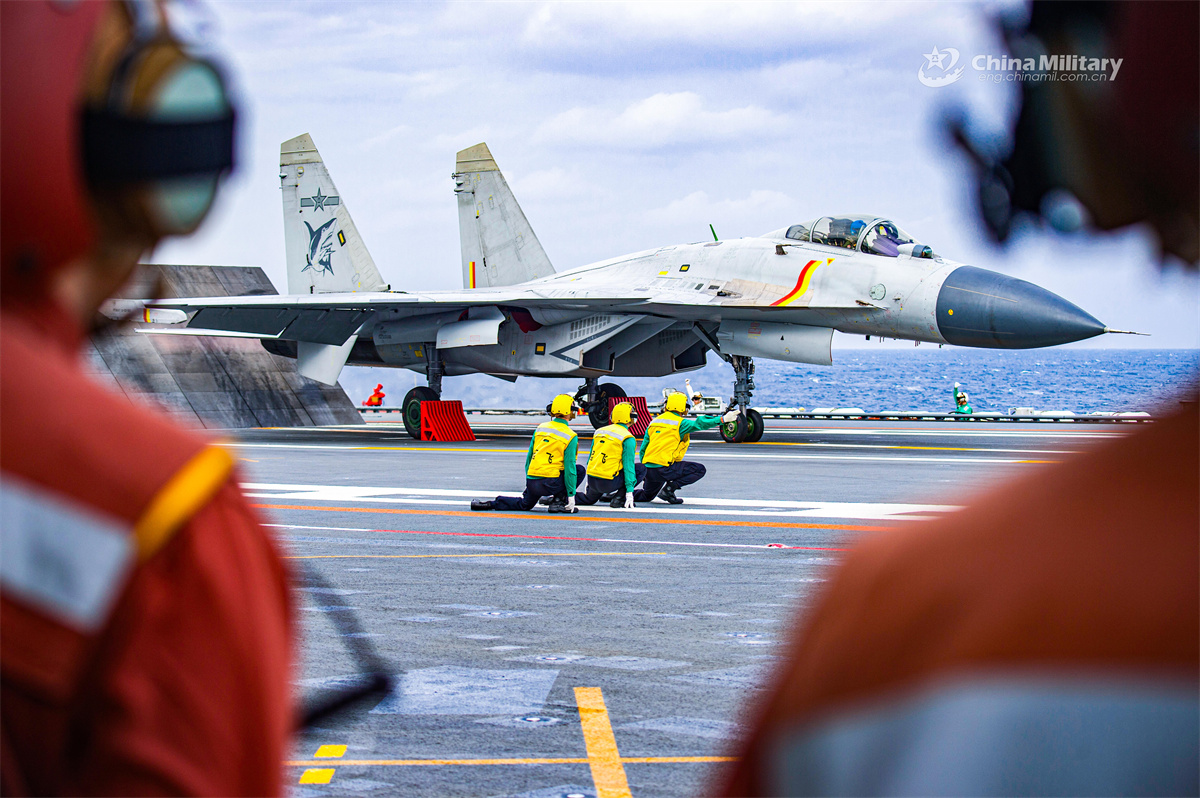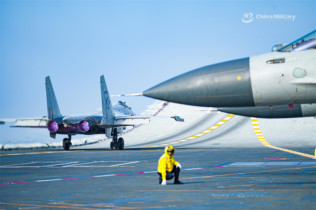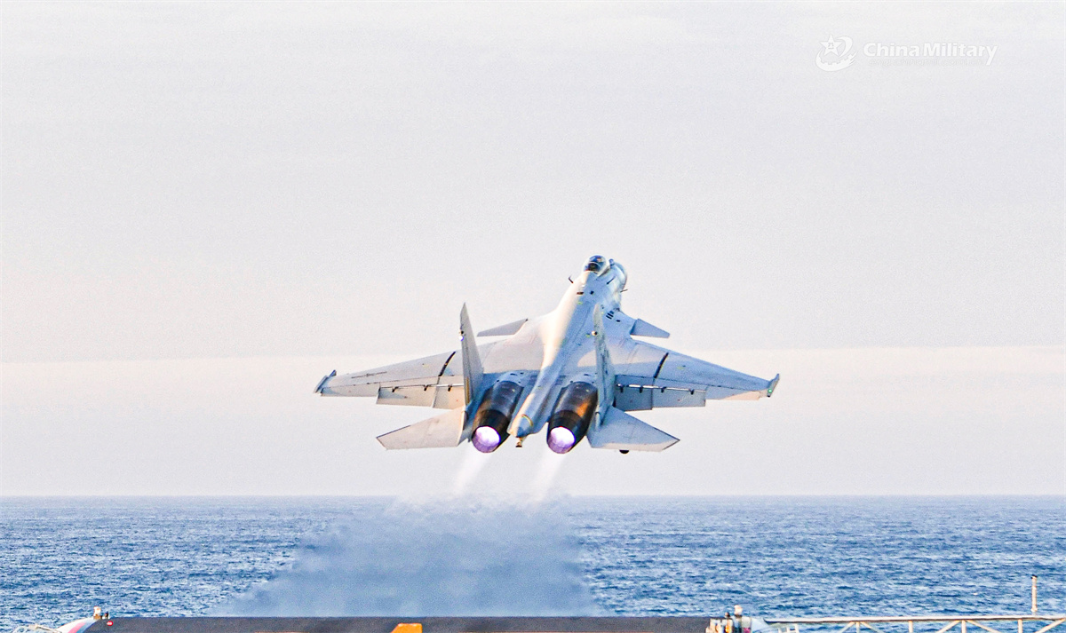 A J-15 carrier-based fighter jet attached to an aviation unit under the Chinese PLA Navy takes off from an aircraft carrier during a flight training exercise in recent days. (eng.chinamil.com.cn/Photo by Zou Ning and Fu Jinquan)