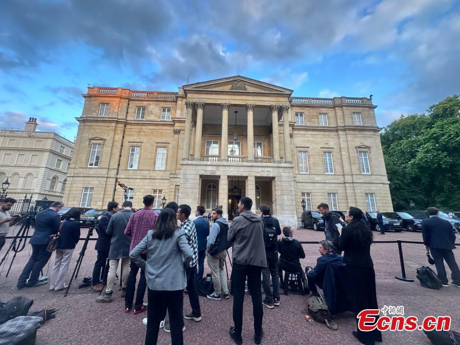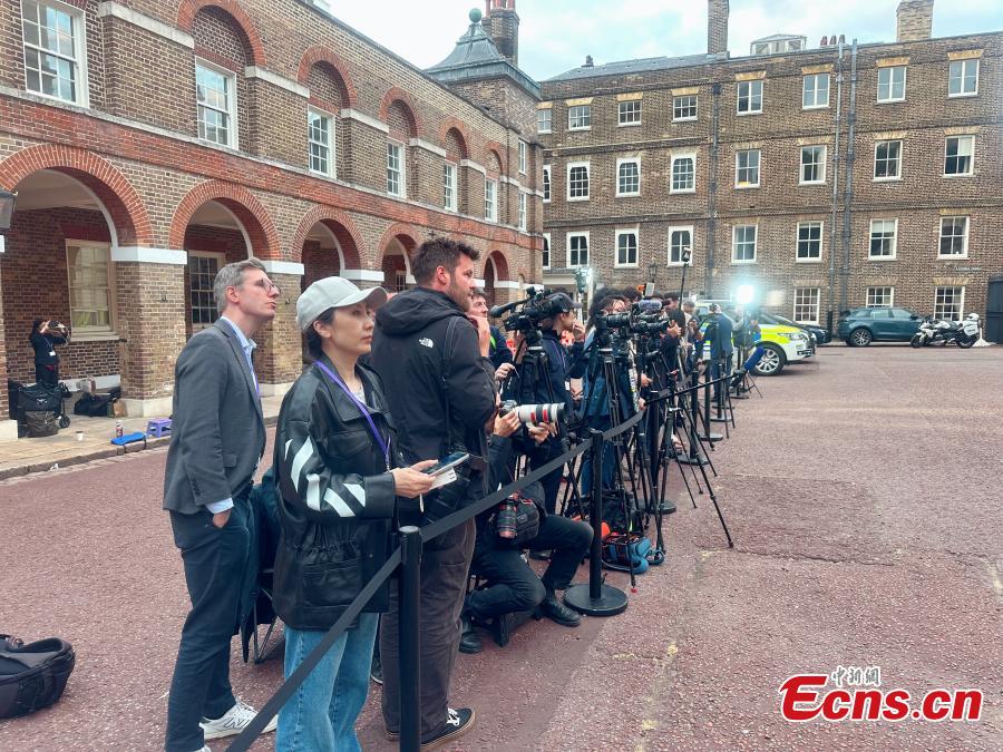 Photo shows journalists waiting outside Lancaster House in London, Britain. (China News Service/Ouyang Kaiyu)