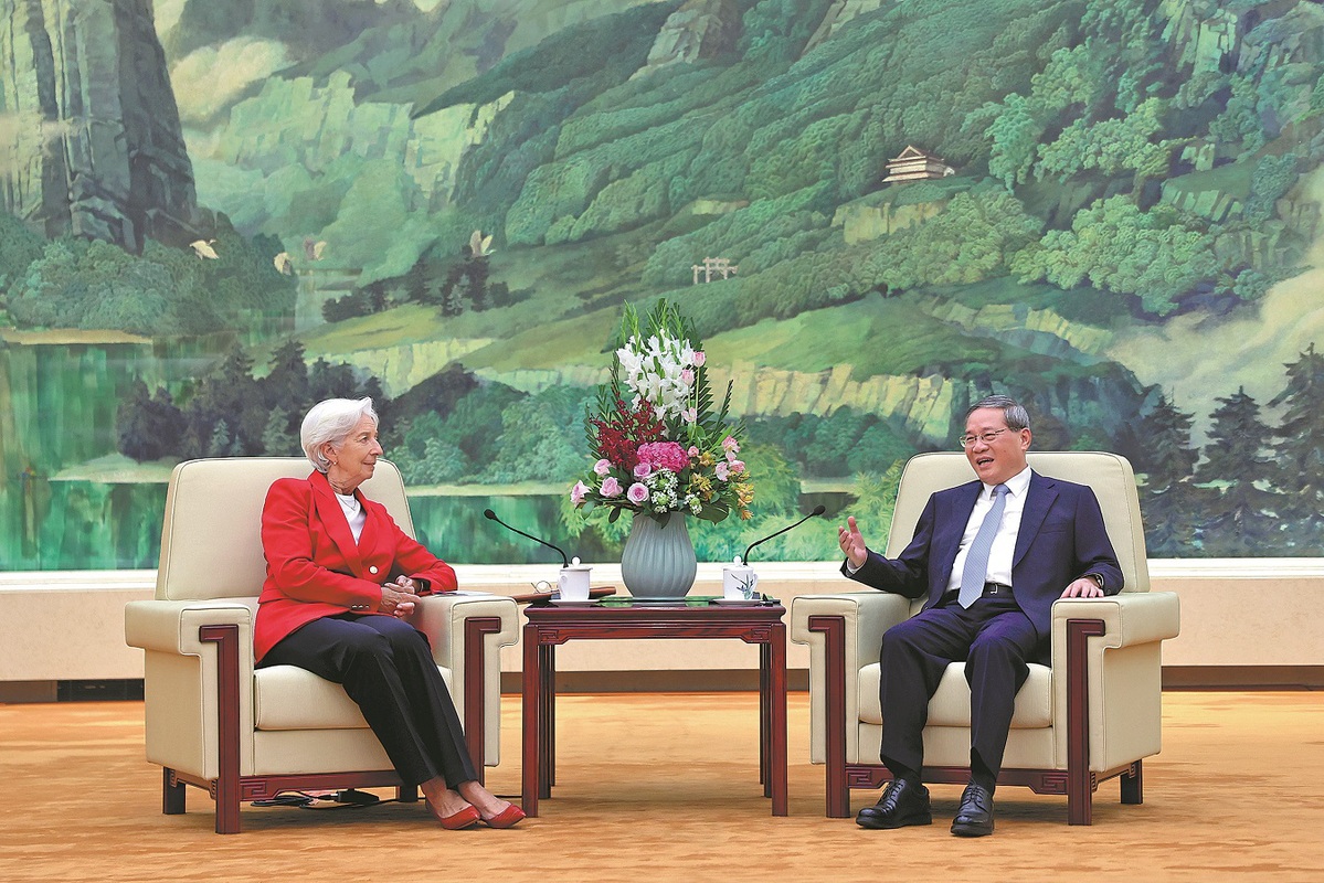 Premier Li Qiang meets on Thursday with Christine Lagarde, president of the European Central Bank, at the Great Hall of the People in Beijing. (Wang Zhuangfei/China Daily)