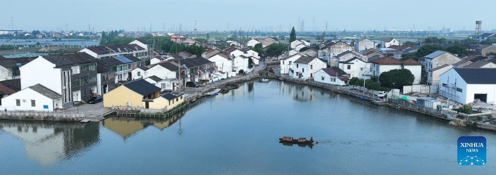 An aerial drone photo taken on June 12, 2025 shows Qian Shoutang trying to sail a black-awning boat in the suburb of Shaoxing, east China's Zhejiang Province. The black-awning boat is unique transportation means in Shaoxing with a long history. The making technique of the black-awning boat was inscribed on the list of provincial intangible cultural heritage of Zhejiang in 2009. Qian Shoutang, 68, is a representative inheritor of the technique in Shaoxing. Born in a family with a black-awning boat making tradition, Qian has engaged himself in making boats for over half a century. Currently, Qian and his apprentices make more than ten black-awning boats each year, primarily for use in scenic areas. "As more and more people, especially young generation, are fascinated with traditional culture, it is meaningful for me to pass down the technique," said Qian. (Xinhua/Weng Xinyang)
