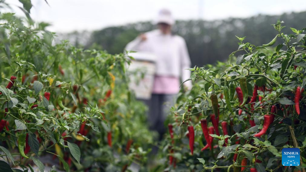 A farmer harvests chili peppers in Youbu Village, Qinnan District, Qinzhou City, south China's Guangxi Zhuang Autonomous Region, June 12, 2025. (Xinhua/Zhang Ailin)