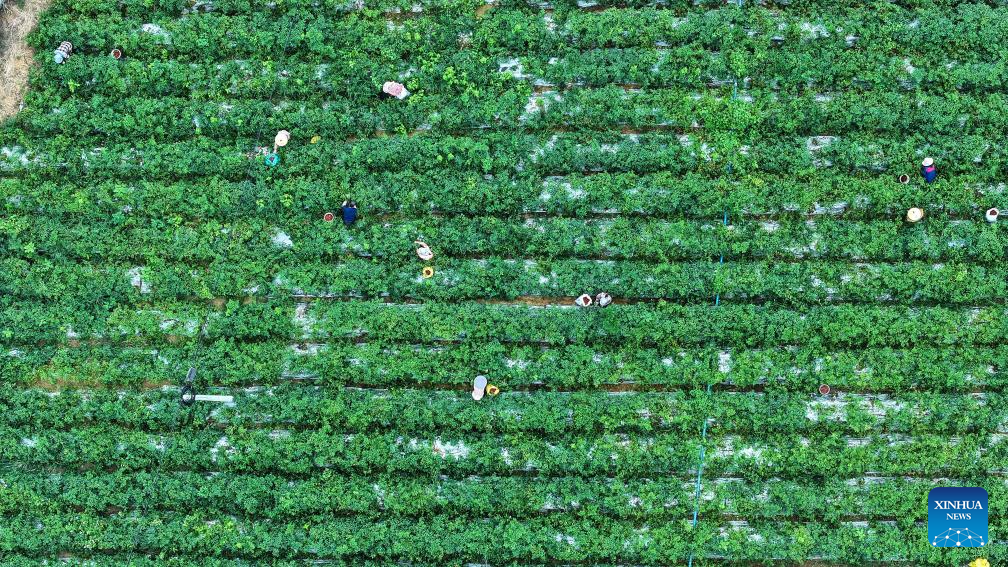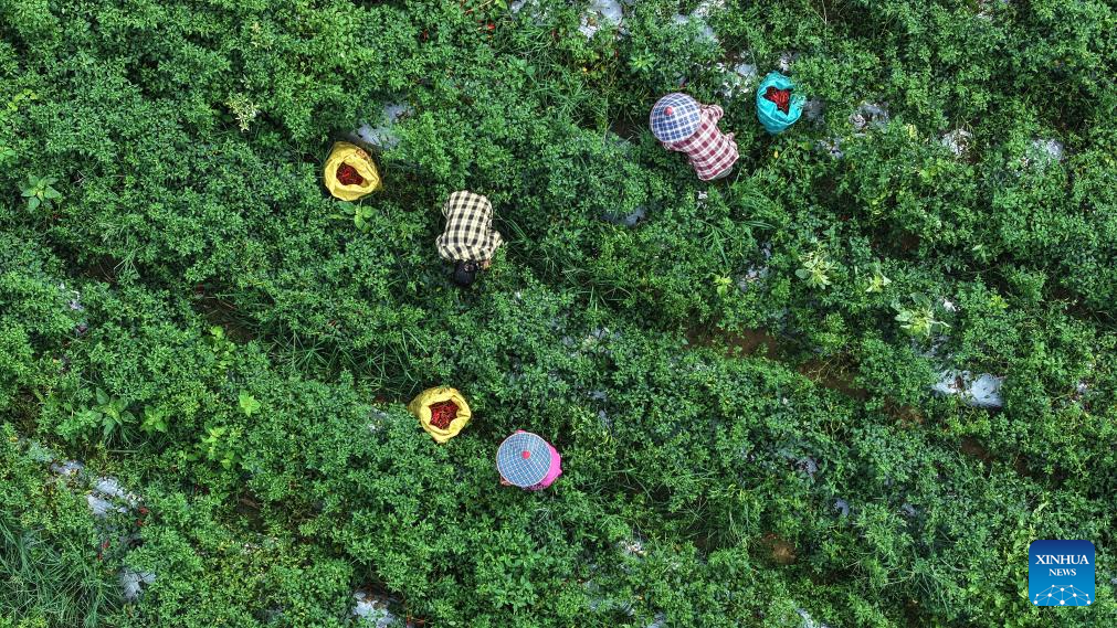 An aerial drone photo taken on June 12, 2025 shows farmers harvesting chili peppers in Youbu Village, Qinnan District, Qinzhou City, south China's Guangxi Zhuang Autonomous Region. (Xinhua/Zhang Ailin)