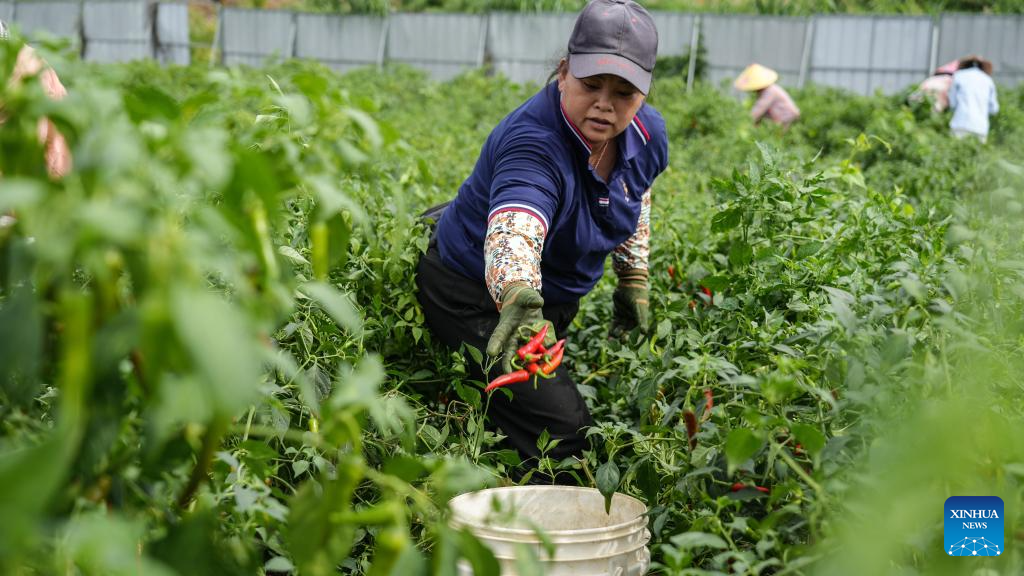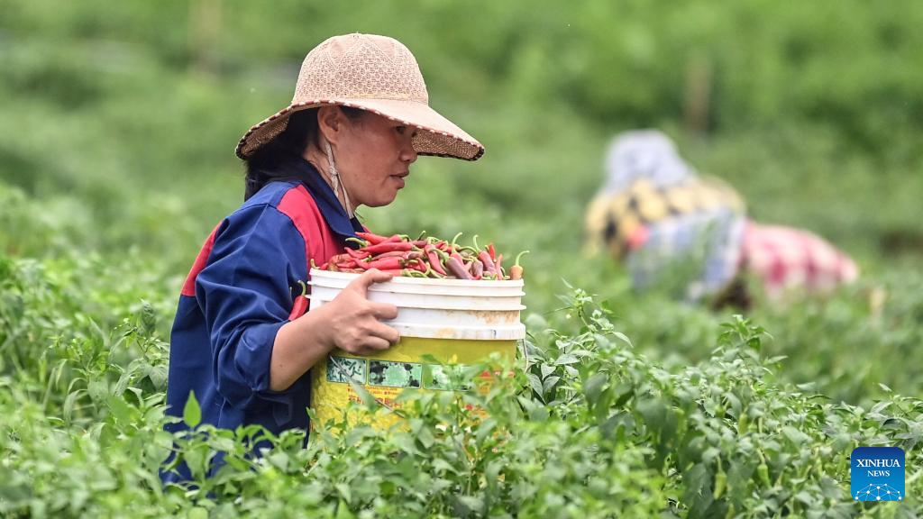 A farmer harvests chili peppers in Qinzhou City, south China's Guangxi Zhuang Autonomous Region, June 12, 2025. (Xinhua/Zhang Ailin)