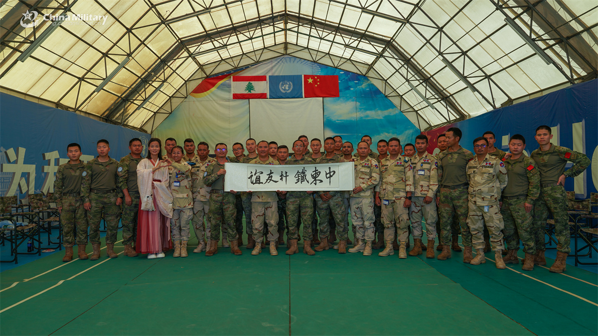 Chinese and Cambodian peacekeepers to Lebanon pose for a group photo during a recent friendly exchange activity held at the camp of the 23rd Chinese Peacekeeping Force to the United Nations Interim Force in Lebanon (UNIFIL). (eng.chinamil.com.cn/Photo by Zhang Boyu)