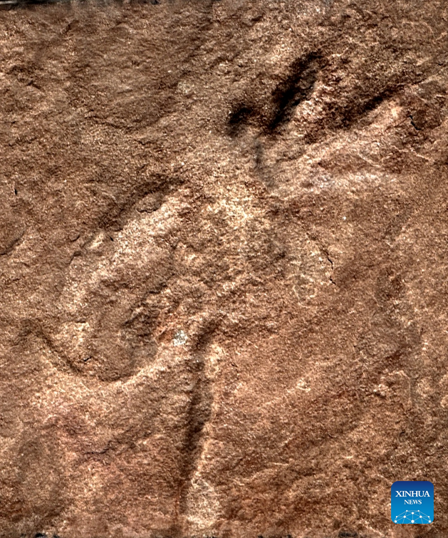 This photo taken on Feb. 19, 2025 shows the footprints discovered in Huaiji County, Zhaoqing City of south China's Guangdong Province. A research team from China University of Geosciences (Beijing) announced Thursday that it has recorded, for the first time, a combination of mammaliaform and dinosaur tracks in Cretaceous strata in Huaiji County, Zhaoqing City of south China's Guangdong Province. The newly discovered mammaliaform track measures just 1.8 centimeters in length, according to the research team. (Photo by Mi Jialin/Xinhua)