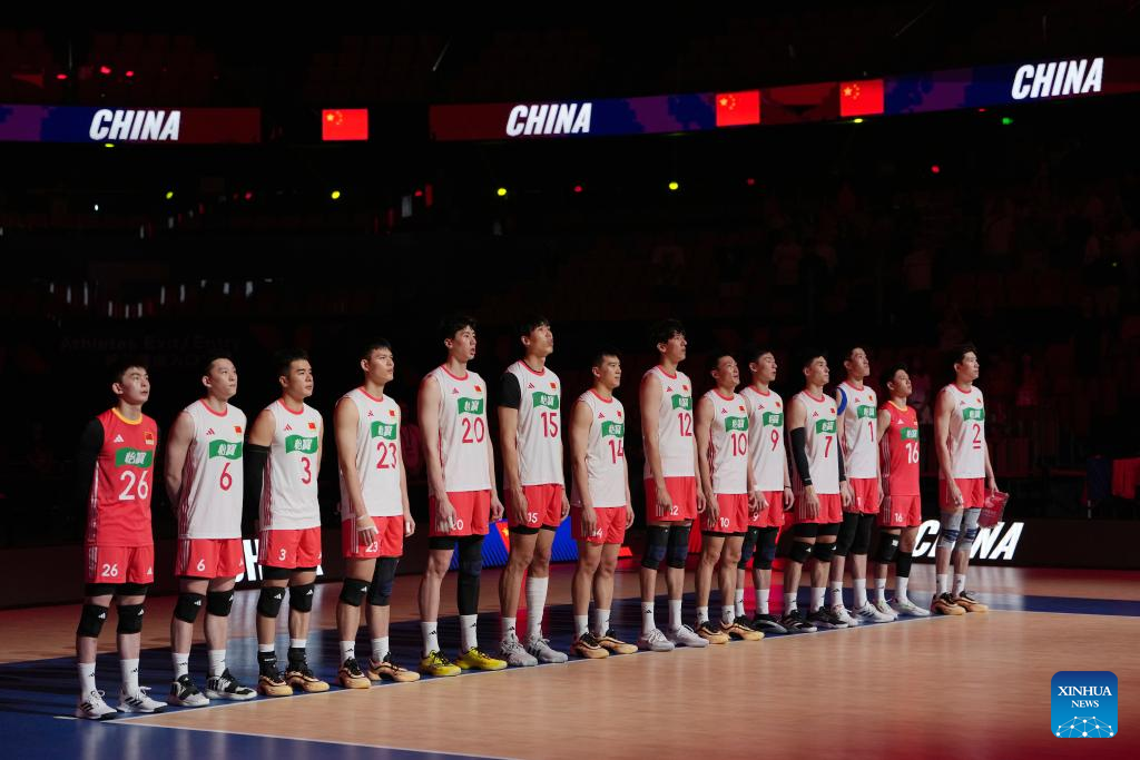 Players of China line up for national anthem before the Pool 3 match between China and Serbia at the Men's Volleyball Nations League (VNL) 2025 in Xi'an, northwest China's Shaanxi Province, June 12, 2025. (Xinhua/Li Yibo)