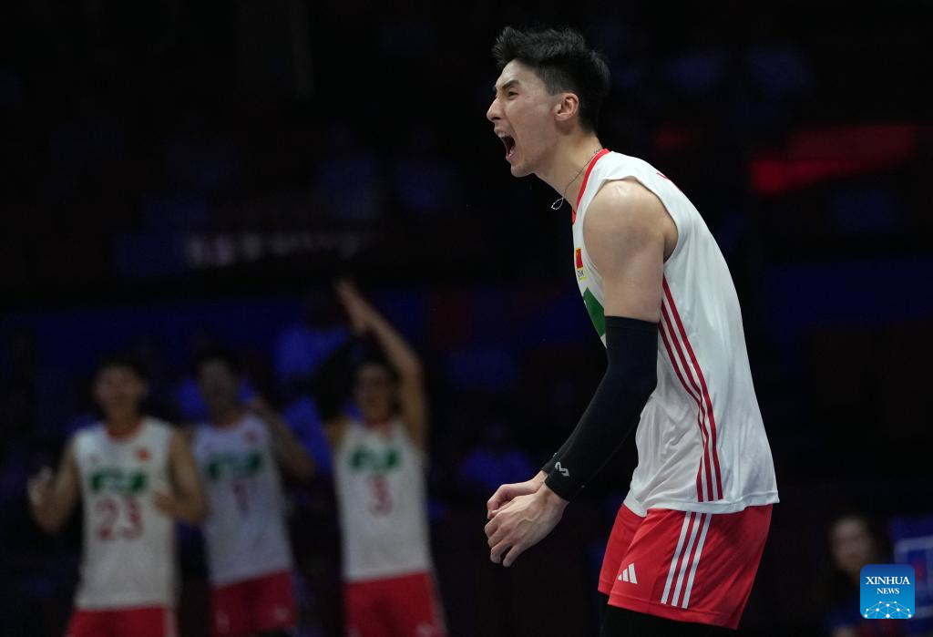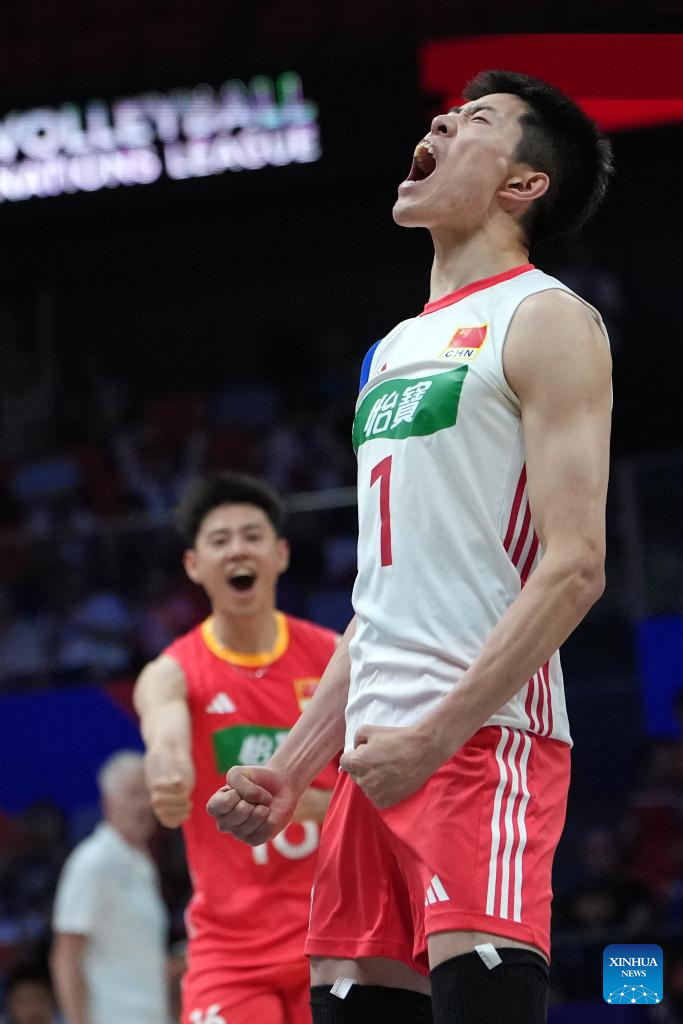 Yu Yaochen of China celebrates scoring during the Pool 3 match between China and Serbia at the Men's Volleyball Nations League (VNL) 2025 in Xi'an, northwest China's Shaanxi Province, June 12, 2025. (Xinhua/Li Yibo)
