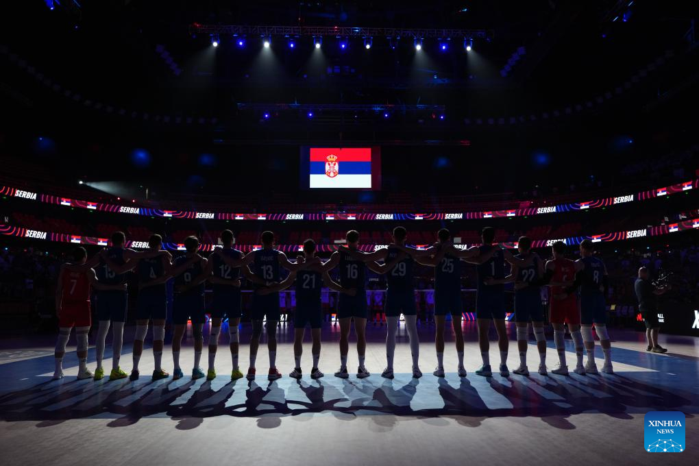 Players of Serbia line up for national anthem before the Pool 3 match between China and Serbia at the Men's Volleyball Nations League (VNL) 2025 in Xi'an, northwest China's Shaanxi Province, June 12, 2025. (Xinhua/Li Yibo)