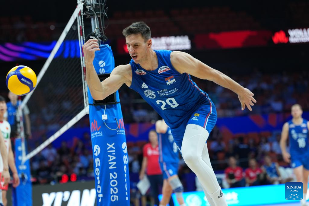 Aleksandar Nedeljkovic of Serbia competes during the Pool 3 match between China and Serbia at the Men's Volleyball Nations League (VNL) 2025 in Xi'an, northwest China's Shaanxi Province, June 12, 2025. (Xinhua/Li Yibo)