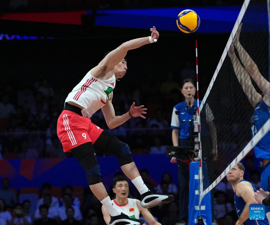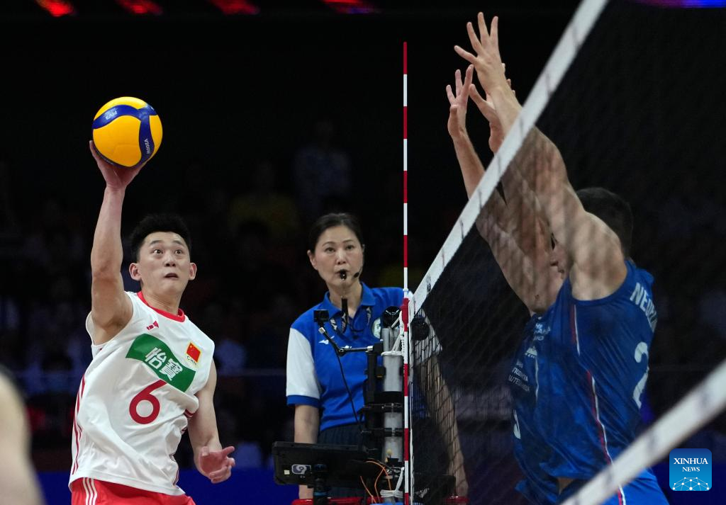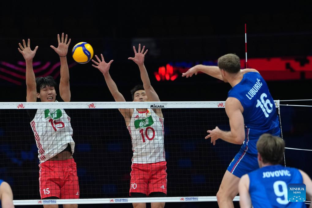 Peng Shikun (2nd L) of China spikes the ball during the Pool 3 match between China and Serbia at the Men's Volleyball Nations League (VNL) 2025 in Xi'an, northwest China's Shaanxi Province, June 12, 2025. (Xinhua/Li Yibo)