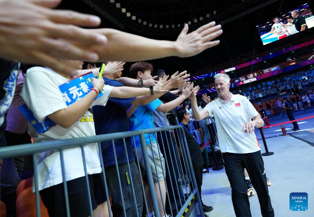 Head coach of China Vital Heynen (R) claps hands with spectators after the Pool 3 match between China and Serbia at the Men's Volleyball Nations League (VNL) 2025 in Xi'an, northwest China's Shaanxi Province, June 12, 2025. (Xinhua/Li Yibo)