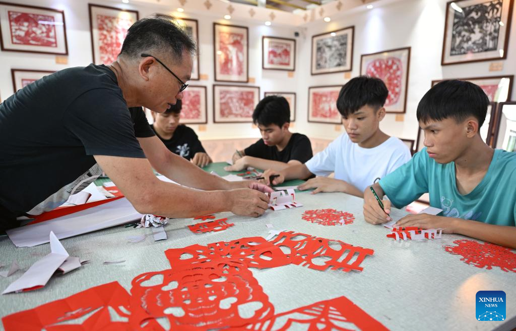 Students learn the paper-cutting techniques of the Li ethnic group under the guidance of a teacher at Hainan Minzu Technical School in Wuzhishan City, south China's Hainan Province, June 10, 2025. In recent years, Wuzhishan city has launched a project to introduce intangible cultural heritage into campuses, offering related courses in 14 public primary and secondary schools to cultivate teenagers' interest for traditional culture and promote the inheritance and development of intangible cultural heritage. (Xinhua/Guo Cheng)