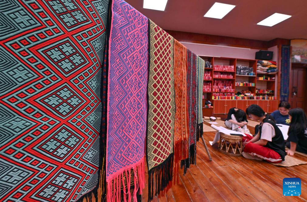 This photo shows pieces of the Li brocade weaved by students displayed at Hainan Minzu Technical School in Wuzhishan City, south China's Hainan Province, June 10, 2025. In recent years, Wuzhishan city has launched a project to introduce intangible cultural heritage into campuses, offering related courses in 14 public primary and secondary schools to cultivate teenagers' interest for traditional culture and promote the inheritance and development of intangible cultural heritage. (Xinhua/Guo Cheng)