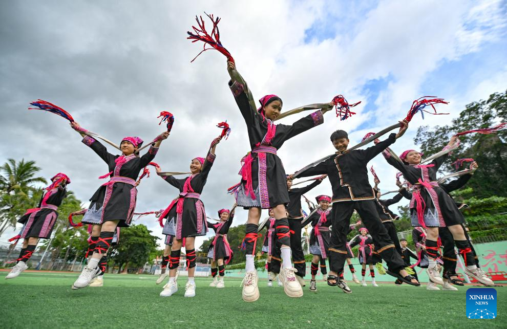 Students practice a traditional dance of the Miao ethnic group at the Hongxing School in Wuzhishan City, south China's Hainan Province, June 11, 2025. In recent years, Wuzhishan city has launched a project to introduce intangible cultural heritage into campuses, offering related courses in 14 public primary and secondary schools to cultivate teenagers' interest for traditional culture and promote the inheritance and development of intangible cultural heritage. (Xinhua/Guo Cheng)