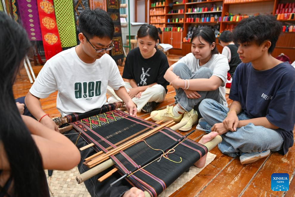 A teacher demonstrates Li brocade weaving techniques to the students at Hainan Minzu Technical School in Wuzhishan City, south China's Hainan Province, June 10, 2025. In recent years, Wuzhishan city has launched a project to introduce intangible cultural heritage into campuses, offering related courses in 14 public primary and secondary schools to cultivate teenagers' interest for traditional culture and promote the inheritance and development of intangible cultural heritage. (Xinhua/Guo Cheng)